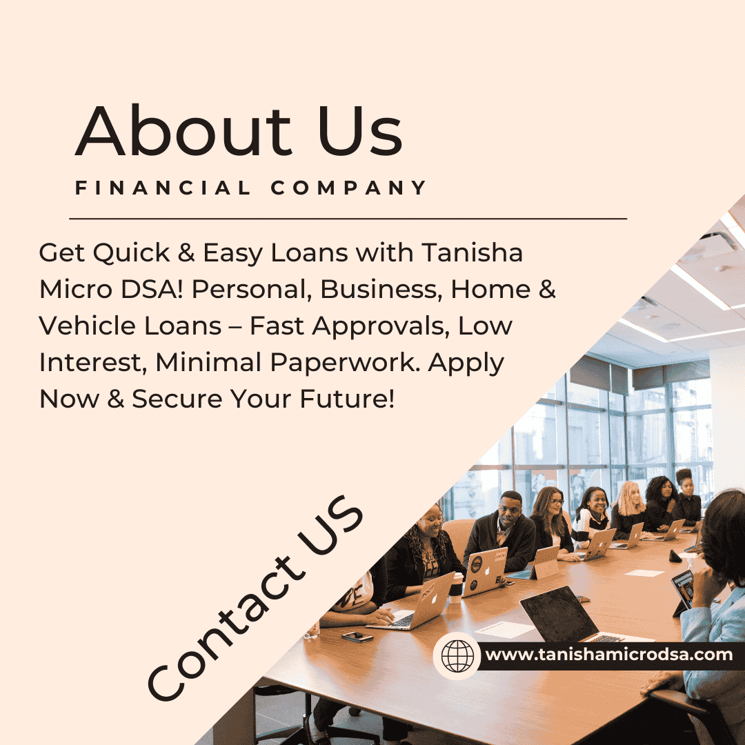 Tanisha Micro DSA is a trusted third-party Direct Selling Agent (DSA) providing seamless financial solutions. We specialize in Personal Loans, Business Loans, Home Loans, Car Loans, and Bike Loans, ensuring quick approvals with minimal paperwork. Additionally, we offer Life, Car, and Bike Insurance to safeguard your future. Our mission is to make financial assistance accessible and hassle-free for individuals and businesses. If you’re looking for investment opportunities, we offer a 10% annual interest rate to investors. With branches across multiple locations, we are committed to serving your financial needs efficiently. Apply today and achieve your financial goals!
